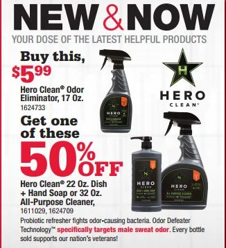 Buy one Hero Clean Odor Eliminator for $5.99 and Get either a Hero Clean 22 oz Dish & Hand Soap OR a 32 oz Hero All-Purpose Cleaner at 50% OFF....