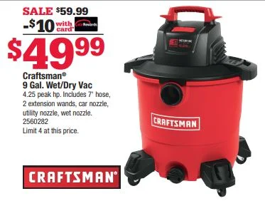 A Craftsman 9 Gal. Wet/Dry VacRegular price $59.99-$10 with Ace Rewards=$49.99