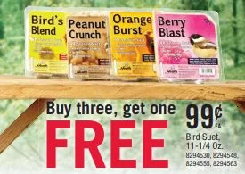Stop by Hometown Ace Hardware and pick up some suet (11 1/4 oz) for your fine feathered friends. Select blends on Reg. Price is 99 cents each on Sale Now Buy 3, Get the 4th one FREE!