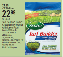Stop Crabgrass before it invades your lawn with Scotts Turfbuilder Halts Crabgrass Preventer with Lawn Food - 5,000 sq. ft coverage is on SALE now for $24.99-$2 with Ace Rewards = $22.99 and the 15,000 sq. ft. coverage is on SALE now for $64.99-$6 with Ace Rewards=$58.99. Limit 2