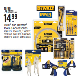 Select IRWIN & DEWALT Tools & Accessories on SALE for $19.99 - $5 with ACE Rewards = Just $14.99 each!