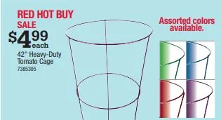 Stop on by and pick up some 42" Heavy Duty Tomato Cages - on SALE NOW for just $4.99. Assorted colors available and while your here, check out our Greenhouse.