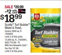 The Sun is Shining. The dandelions are out. Turn your lawn from gold to GREEN with Scotts Turf Builder Weed & Feed. A 5000 sq ft bag is on SALE for $20.99-$2 with Ace Rewards=Just $18.99. Limit 2 at this price. 15,000 sq ft bag on sale for $53.99-$6 with Ace Rewards - so you pay only $47.99. Limit 2