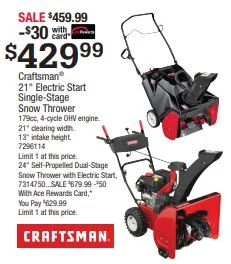 Stop by Hometown Ace Hardware and pick up a Craftsman 21” Electric Start Single-Stage Snow Thrower on SALE for $459.99 - $30 with Ace Rewards = $429.99. The 24” Self-Propelled Dual-Stage Snow Thrower with Electric Start is on SALE, too. $679.99 - $50 with Ace Rewards = $629.99