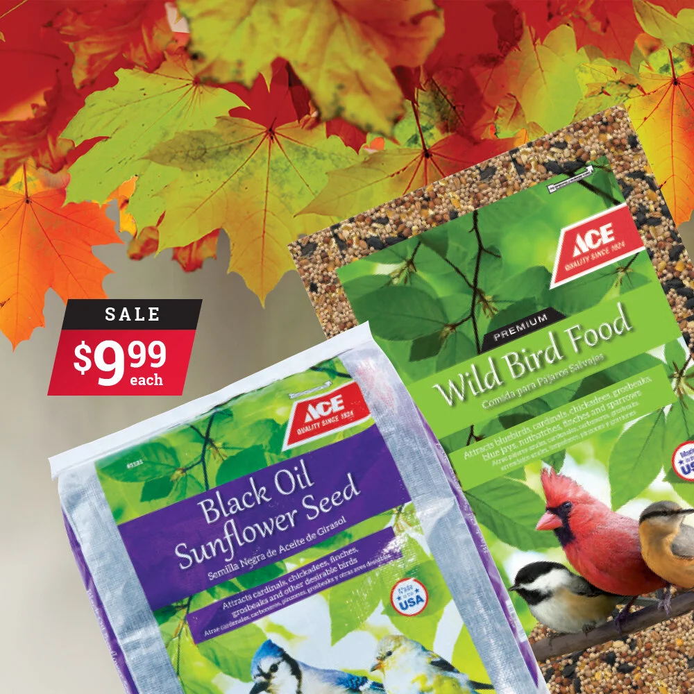 Stock up for your feather friends with Ace Black Oil Sunflower Seed (20 lb.) or Wild Bird Food, (40 lb.) for $9.99 at Hometown Ace Hardware on SALE through October 31st.