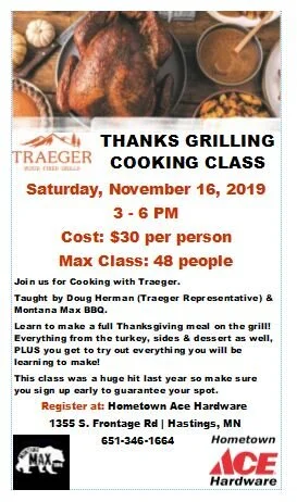 4 DAYS until ThanksGrilling Class! Those that come to the class are going to get a GREAT DEAL on ALL Traeger products that night. You DON'T want to miss this!!! Sign up at Hometown Ace Hardware while there's still room.