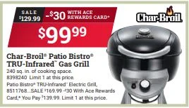 Buy the Char-Broil Patio Bistro TRU-Infrared Gas Grill for $129.99 and get $30 off with your Ace Rewards Card making it just $99.99.