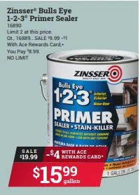 Now's the time to finish up those Honey-Do projects. Stop by Hometown Ace Hardware and pick up some Zinsser Bulls Eye 1-2-3 Primer Sealer - on SALE NOW for $19.99 - $4 with Ace Rewards = Just $15.99 gallon.
