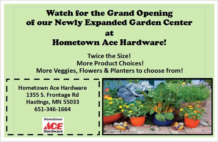 The grass is greening up and our Newly Expanded Garden Center will be going up soon! Hometown Ace Hardware will be your place to get vegetable plants for your garden and flowers to spruce up your home! Plus more planters & decorations to choose from. Watch for our greenhouses...going up soon!
